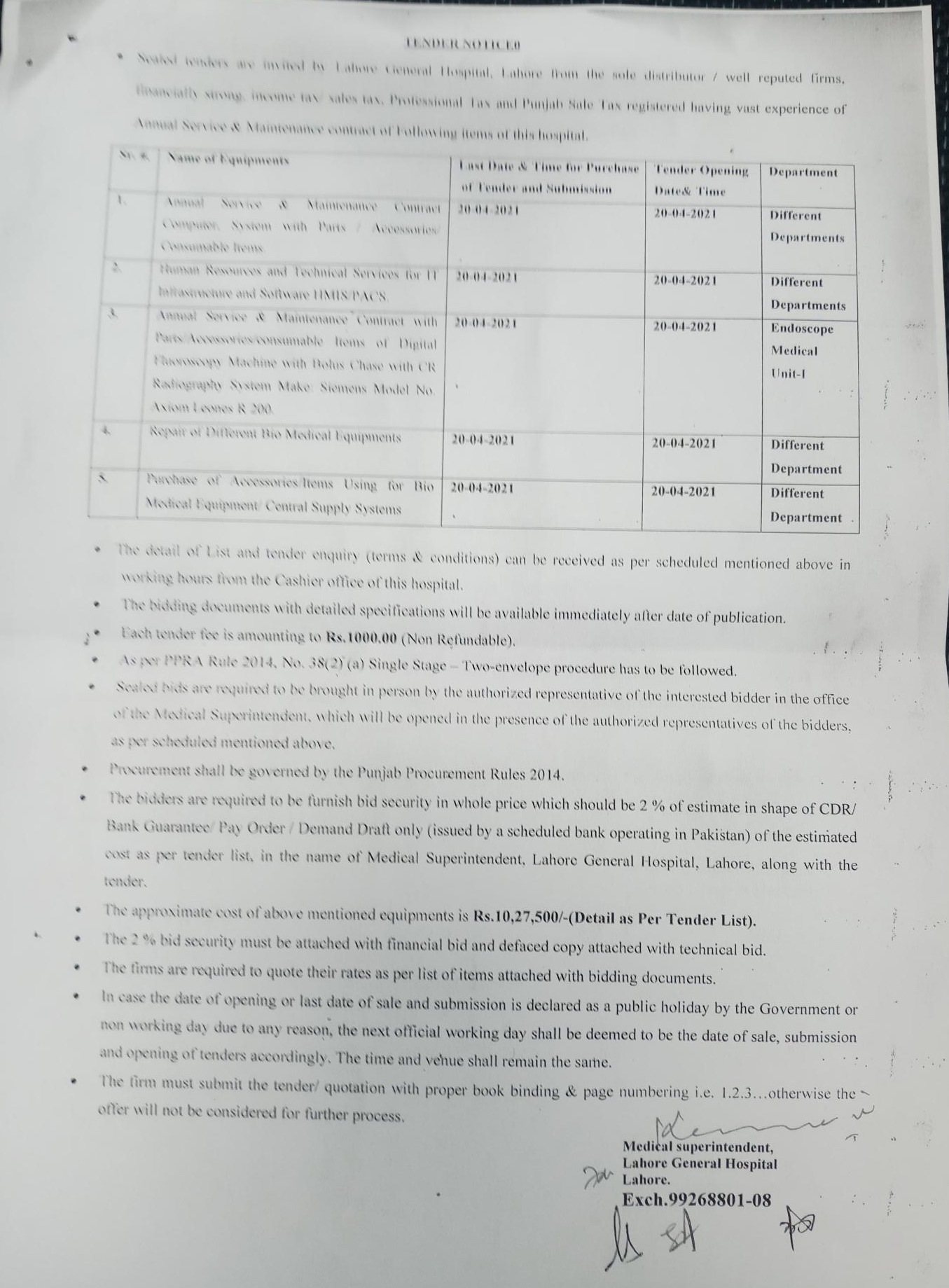 - Tender Notice for the purchase of 1.5 tesla MRI Machine and 128 slice CT scan machine.